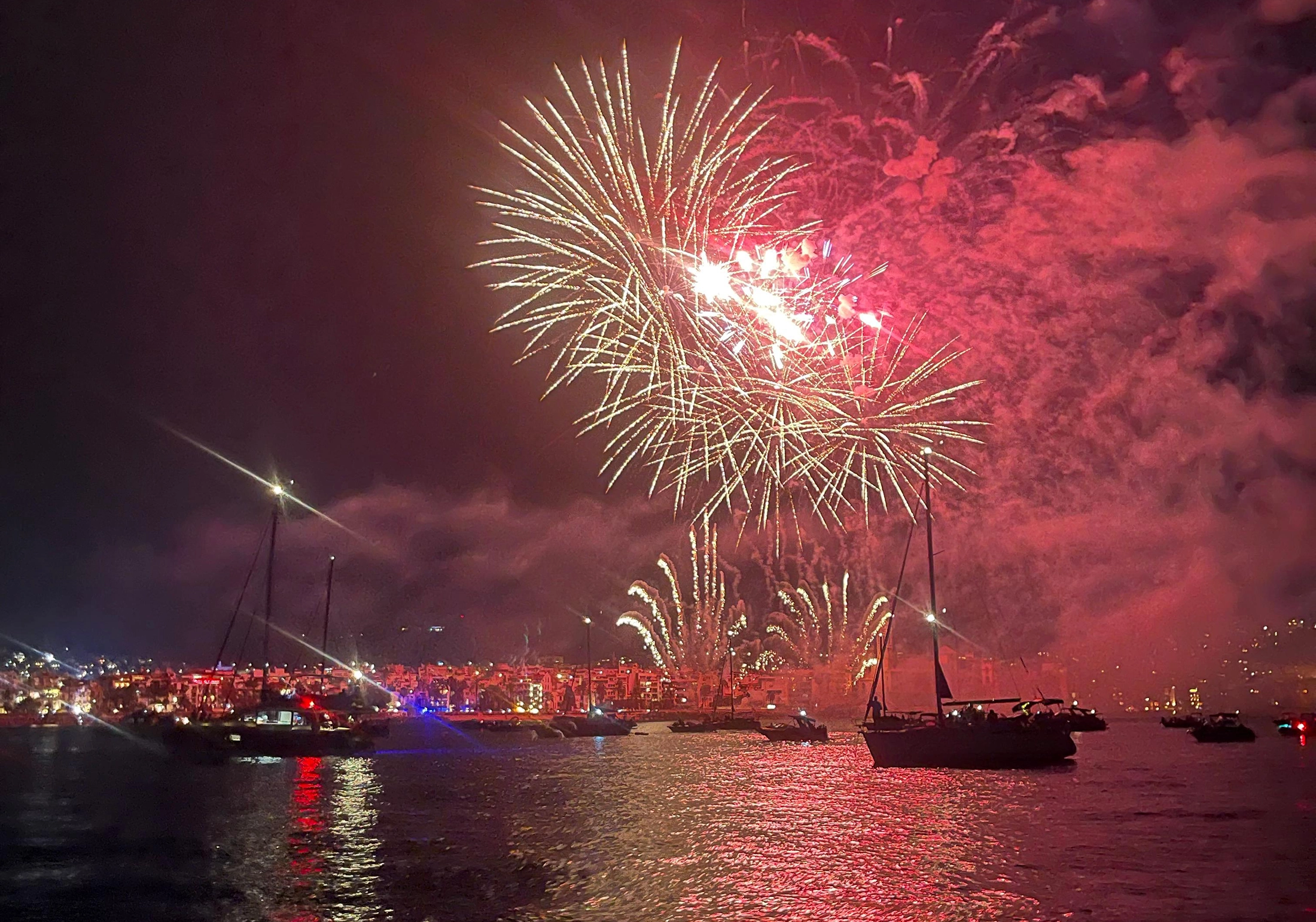 Imagínatelo: tú y tu pareja, o tu grupo de amigos, navegando frente al paseo marítimo a bordo de los veleros Aida y MonAmour, con una copa de cava en la mano, un picoteo dulce y salado para disfrutar a bordo, música suave de fondo… y los fuegos explotando sobre vuestras cabezas, reflejados en el mar.
